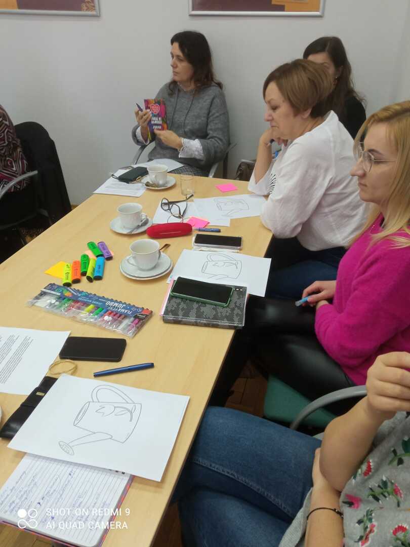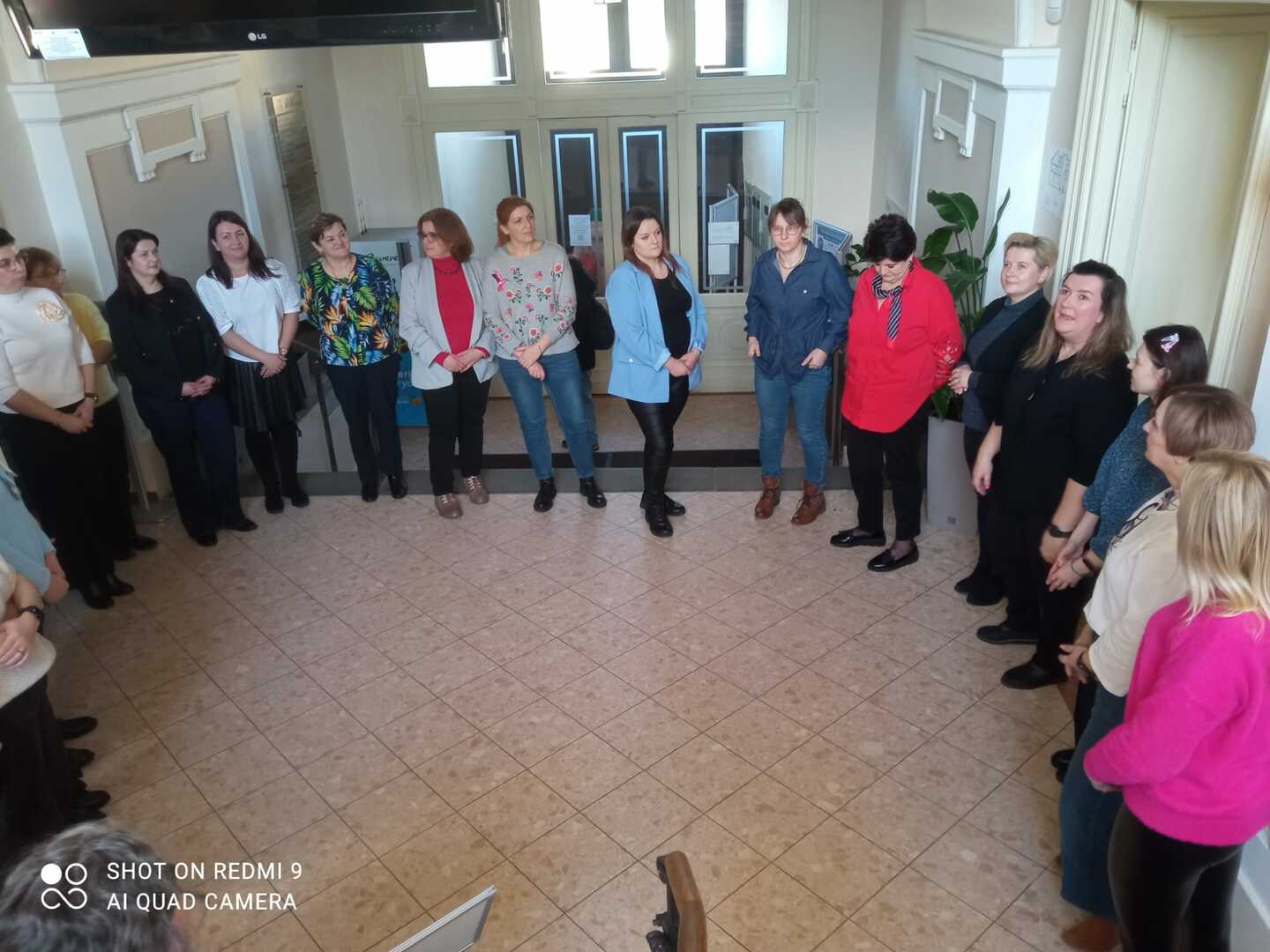 Przy stolikach siedzą uczestnicy spotkania, przed nimi stoją dwie kobiety, w tle prezentacja multimedialna Grupa kobiet siedzi przy stoliku. Na stoliku notesy, filiżanki, flamastry Grupa kobiet siedzi przy stolikach w sali. Przed nimi stoi prowadząca spotkanie kobieta. Przy stolikach siedzą uczestnicy spotkania. W tle banner z pegazem. Prowadzące spotkanie kobiety mówią do uczestników spotkania Grupa kobiet stojących w kole.