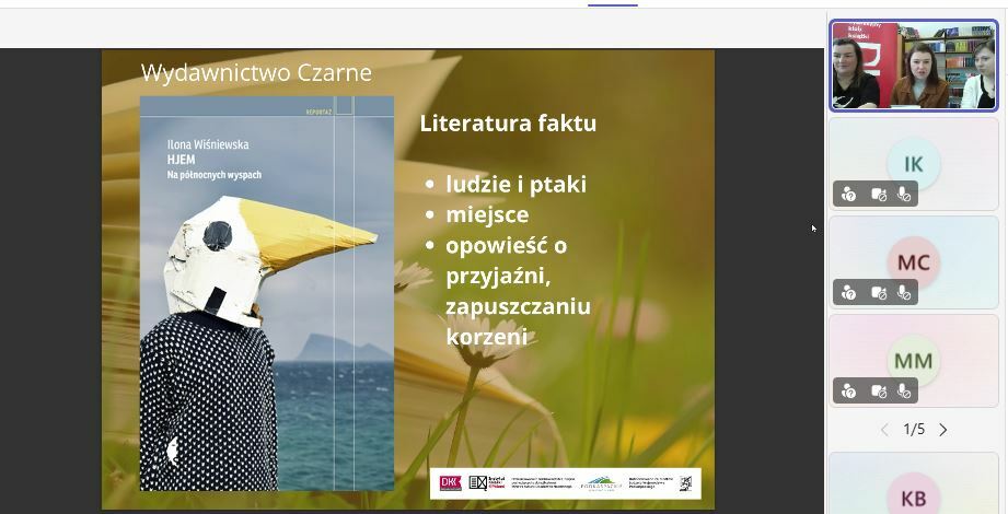 W trakcie spotkania on-line koordynatorki DKK Marcelina Janisz, Katarzyna Buczek i Małgorzata Lis zaprezentowały najnowsze tytuły: „Hjem” Ilony Wiśniewskiej, „Niewidzialne miasta” Italo Calvino, „Męskie gadanie 2” Beaty Biały, „Krwinki” Doroty Groyeckiej, „Inny dom” Jędrzeja Dudkiewicza, „Astrid Lindgren” Margarety Stromstedt i „Kairos” Jenny Erpenbeck.