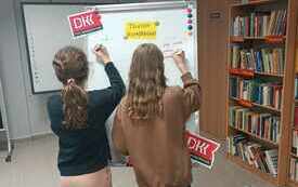 Kilkoro dzieci patrzy i ogląda album ze zdjęciami. Kilka osób siedzi i czyta książki przy stole. Dzieci pozują do wspólnego zdjęcia, na tle tablicy z logo DKK. Dwie dziewczynki piszą coś na tablicy.