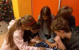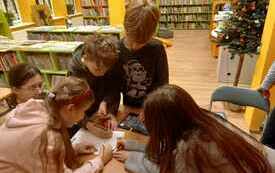 czytanie to nie lada przygoda. Na klubowiczów czekała gra, tak jak to mieli obiecane na poprzednim spotkaniu. Były anagramy, szyfry, rebusy, diagramy itp. Wszystkie zadania dotyczyły zbliżających się świąt i oczywiście były ukryte w różnych miejscach. Ale to nie wszystko, bo w dalszej części z uwagi na magiczny czas zbliżających się świąt,  dzieci wykonywały świąteczne zakładki. W ten właśnie sposób dobrnęliśmy do końca roku, ale mamy nadzieję że nasze spotkania w przyszłym 2024 roku będą tak samo przyjemne, radosne i twórcze.