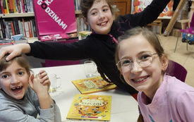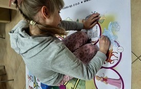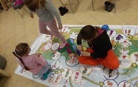 Trzy dziewczynki siedzą przy stole, w tle plakat Dyskusyjnych Klubów Książki. Trzy dziewczynki grają na podłodze w grę planszową. Dwie dziewczynki siedzą, jedna stoi na planszy. Dwie dziewczynki grają na planszy, obok kostka do gry. Dziewczynka siedzi na podłodze i koloruje rysunek.