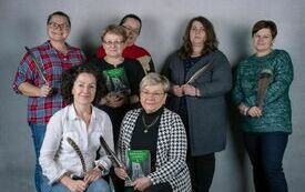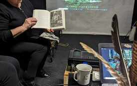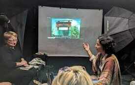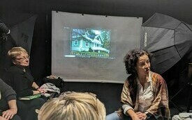 Grupa kobiet stoi w dwóch rzędach. Trzymają książki i pióra. Dwie kobiety siedzą naprzeciwko siebie. Jedna znich wskazuje na ekran. Kobieta pokazuje otwartą książkę. W tle ekran filmowy. Dwie kobiety siedzą, na pierwszym planie głowa trzeciej kobiety. W tle ekran filmowy.Ciemne pomieszczenie.
