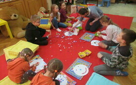 Po wysłuchaniu treści książeczki wspólnie obejrzeliśmy krótki filmik opowiadający o zwyczajach i tradycjach związanych ze Świętami Bożego Narodzenia. Następnie dzieci wzięły udział w świątecznym quizie odpowiadając na pytania o wigilijnych potrawach, choince i uroczystej Pasterce.