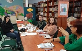 Pięć kobiet siedzi przy stole i rozmawia Na stole stoi książka oraz dekoracja bożonarodzeniowa prezentująca anioła