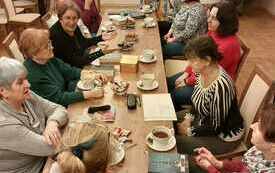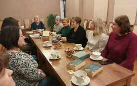 Grupa kobiet siedzi przy stole i rozmawia, na stole książki, filiżanki, talerze. W tle po prawej stonie świerk, po lewej fortepian. Grupa kobiet siedzi naprzeciwko siebie i patrzą w swoją stronę. Na stole książki, filiżanki i talerze, ciastka.