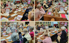 Grupa ludzi siedzi dookoła stołu, bibliotekarka stoi i mówi. Na stole zakładki i logotypy DKK, w tle plakat DKK. Grupa ludzi, członków DKK z torbami z logotypami DKK. Plakat DKK po prawej stronie. Kolaż zdjęć, na których grupa ludzi siedzi przy stole.