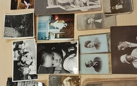Grupa ludzi siedzi w półmroku przy stole. Książka "lata" przykryta kartkami papieru. Stare fotografie z dzieciństwa.