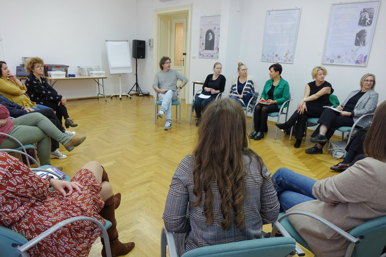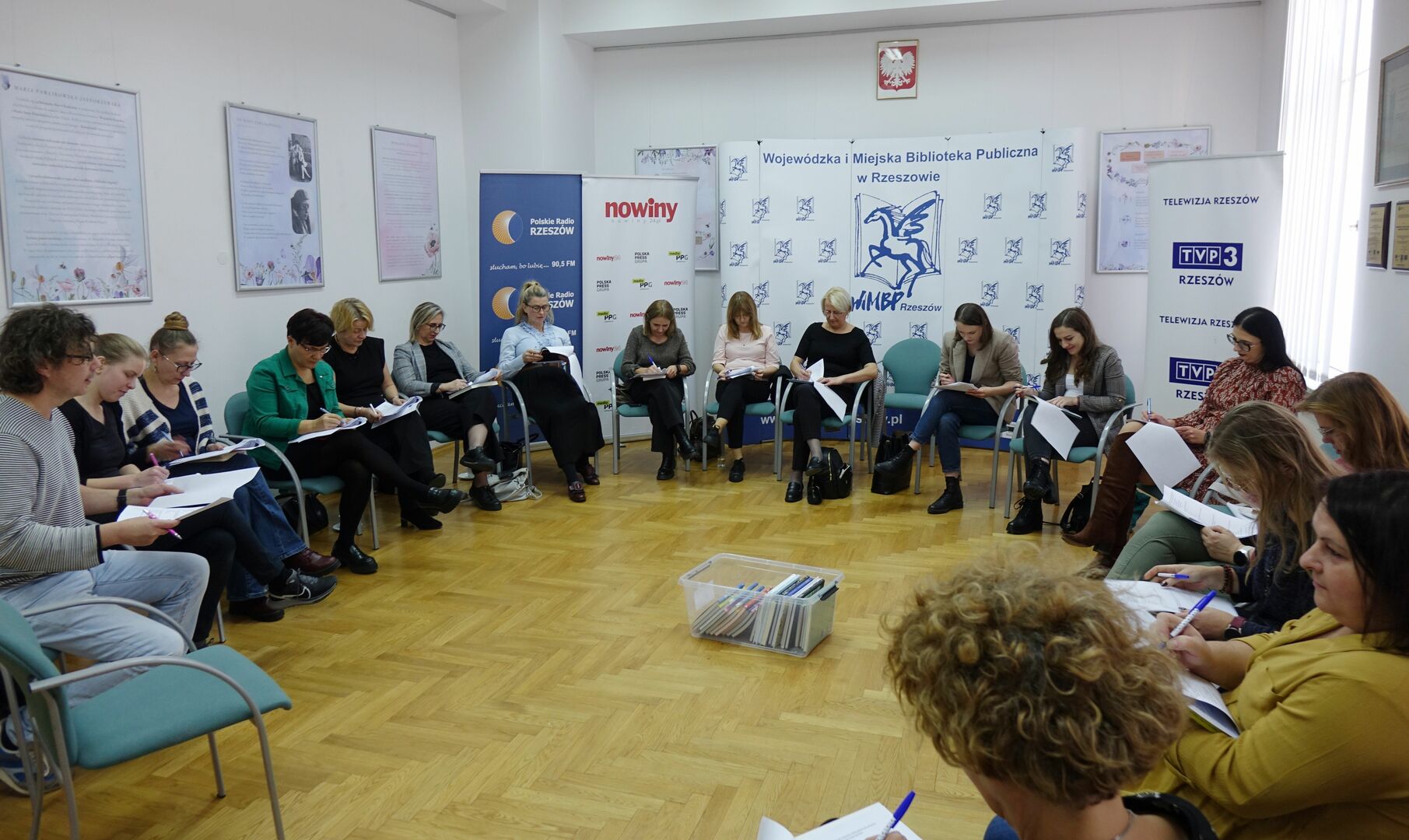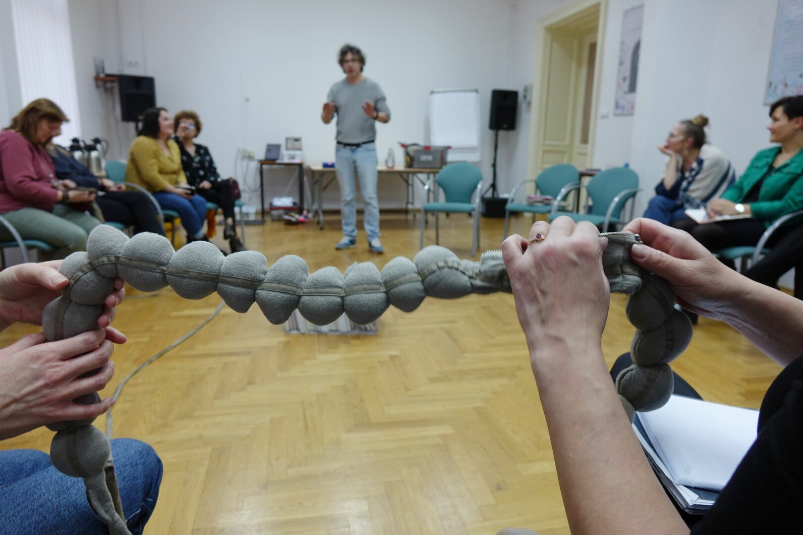 Na krzesłach wokół sali siedzą uczestnicy spotkania. Na podłodze porozrzucane kartki Uczestnicy spotkania siedzący wokół na krzesłach. Prowadzący spotkanie z książką w ręku zwrócony do siedzących wokół uczestników warsztatów. Pośrodku sali pudełko z książkami, wokół uczestnicy spotkania piszący coś na kartkach. Dwie osoby trzymające w rękach dwa końce sznura w formie kulek z materiału. Stworek z papieru z włosami z włóczki. W tle uczestnicy warsztatów.