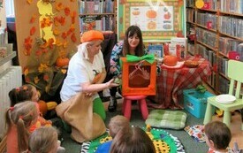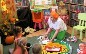 W październiku zaś (28.10.2023 r.) świętowaliśmy „Dzień dyni”. Wspólne czytanie wierszy o dyniach bardzo zaciekawiło dzieci. W tym dniu rządził kolor pomarańczowy. Odkryliśmy co dynia skrywa wewnątrz, jak jest zbudowana i czy można policzyć ukryte nasionka. Sporo uśmiechów dała nam „skrzynia zgadula”. Mali czytelnicy oraz rodzice mieli za zadanie odgadnąć, co trzymają w dłoniach - nawet bakłażan nie sprawił najmłodszym dużych trudności. Wszyscy w nagrodę otrzymali dyniowe medale. Wspólnemu wyszywaniu filcowej dyni towarzyszyły rozmowy o przepisach kulinarnych na jesień. Mamy chętnie sięgnęły po książki z przepisami np. na dyniowe muffinki, a dzieci przekonały się, że dynia też może być smaczna. Dyniowe spotkanie zacieśniło nasze czytelniczo-kulinarne relacje.