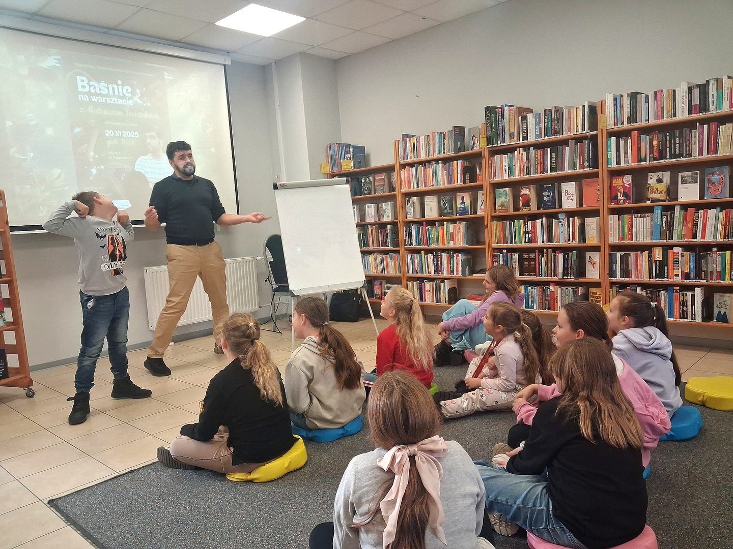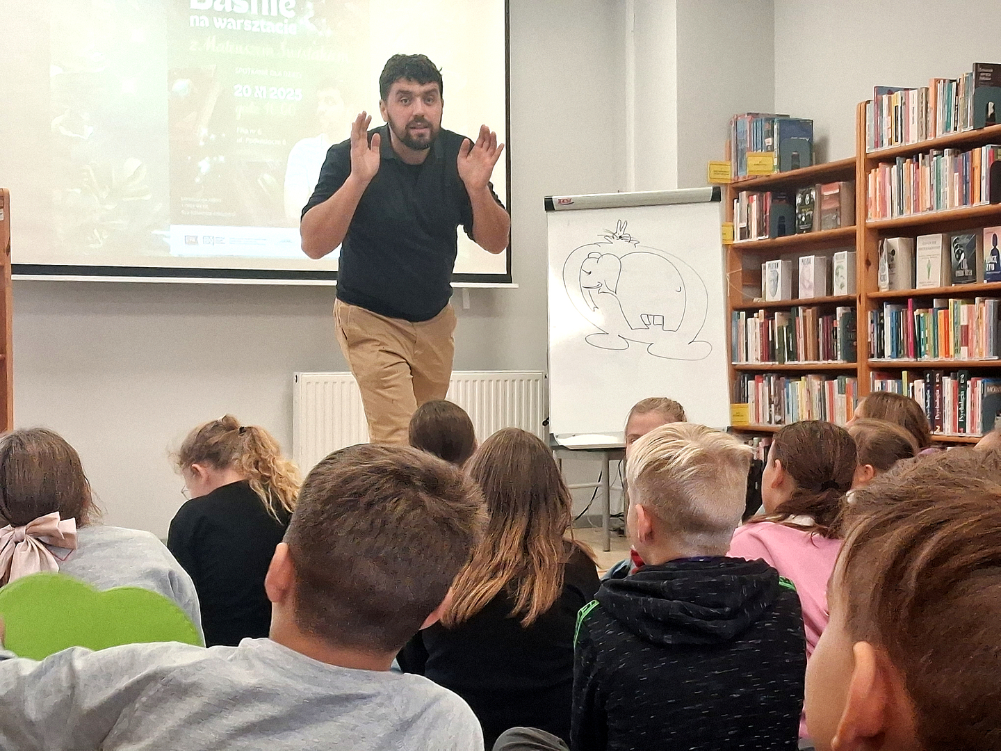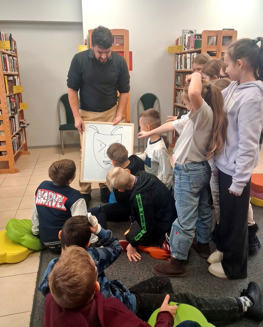 Spotkanie „Baśnie na Warsztacie” okazało się nie tylko świetną zabawą, ale także piękną lekcją kreatywności i odwagi w opowiadaniu własnych historii. Dziękujemy Mateuszowi Świstakowi za niezwykłą energię i inspirację, a wszystkim uczestnikom – za otwarte serca i umysły oraz radość, którą wnieśli do naszej biblioteki.