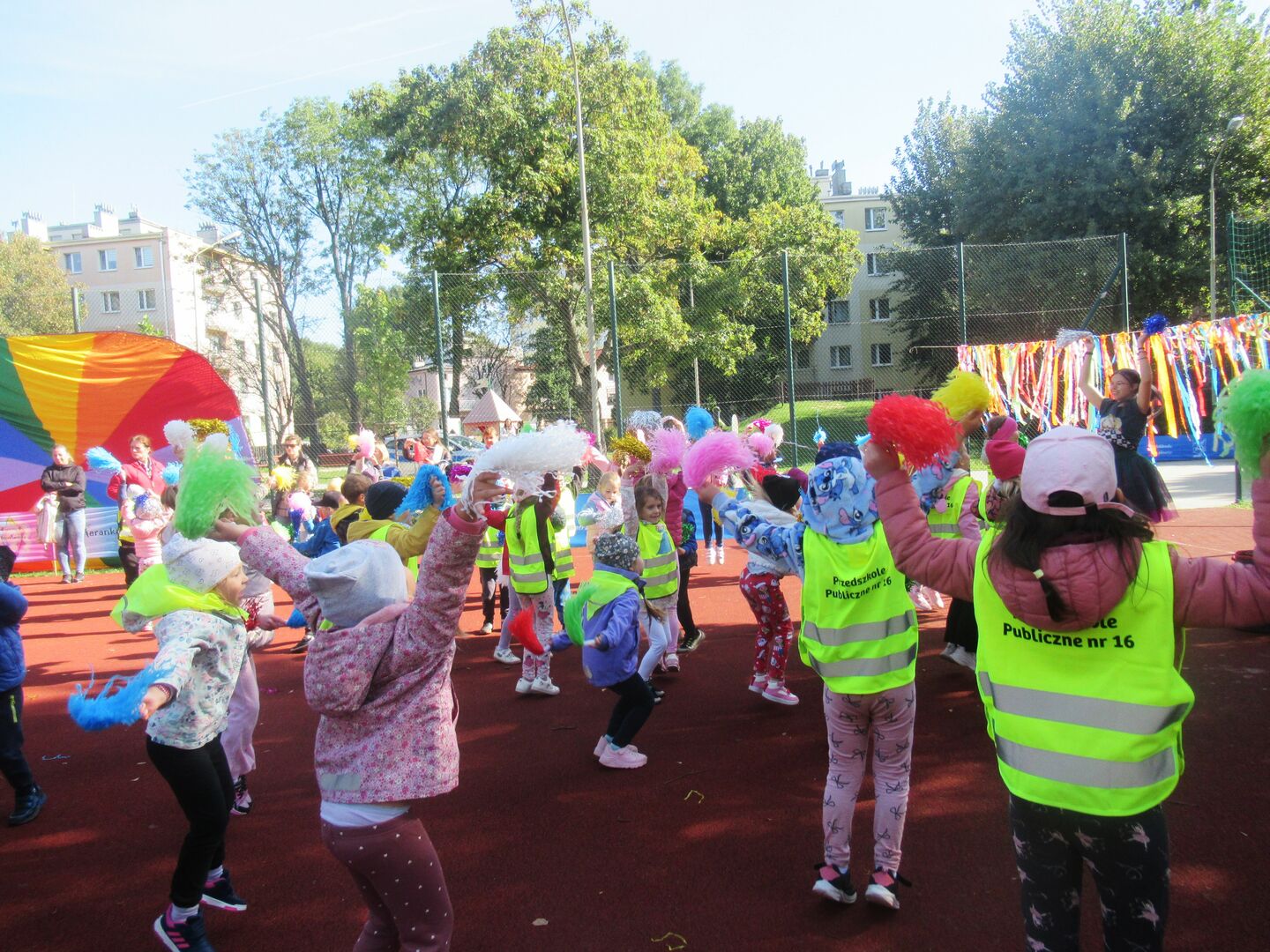 Grupa dzieci kamizelkach odblaskowych siedzi na ławkach wśród zieleni. Przed nimi pluszowy miś. Pluszowy miś, pszczółka, policjanci stoją przed zebraną publicznością. Czytająca policjantka, przed nią grupa dzieci. Na boisku policjant z psem. Wokół dzieci wraz z opiekunami. Grupa dzieci tańczących z kolorowymi pomponami. Dwóch chłopców karmiących alpaki w otoczeniu zieleni.