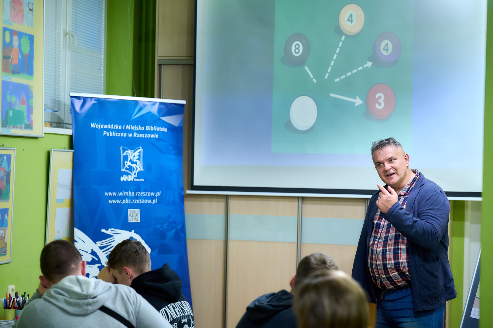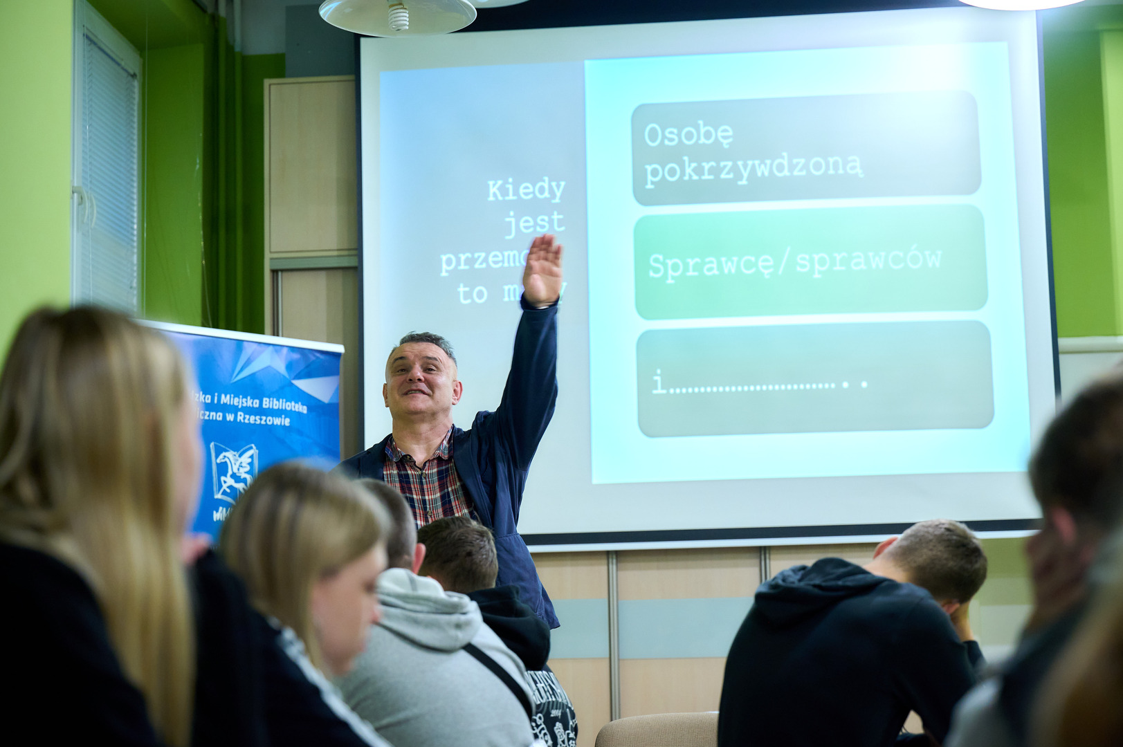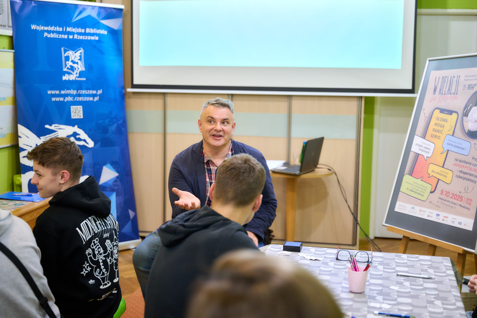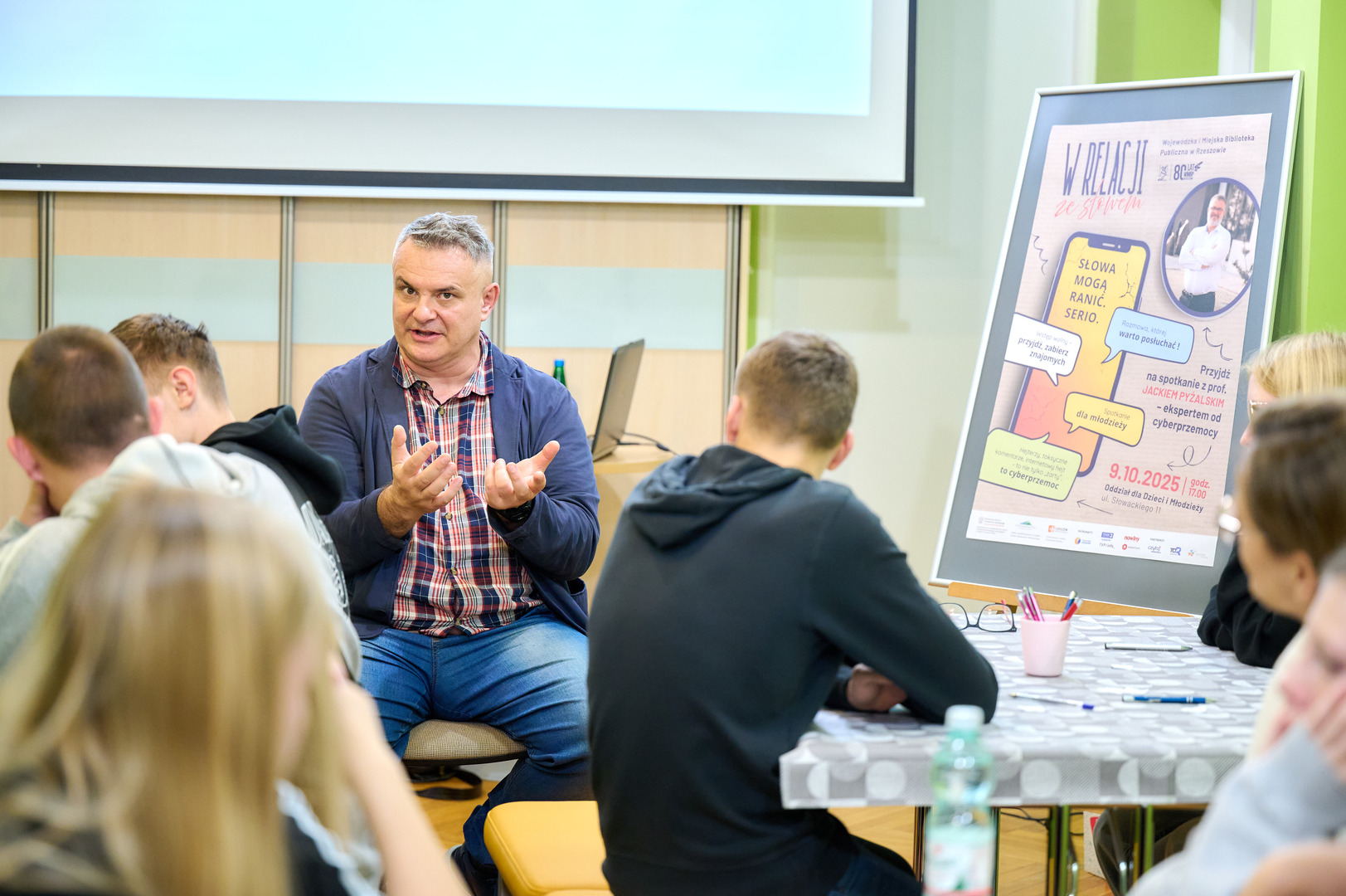 W czwartek, 9 października 2025 roku, w Oddziale dla Dzieci i Młodzieży przy ul. Słowackiego 11 odbyło się kolejne spotkanie realizowane w ramach projektu „W relacji ze słowem”. Tym razem nasza biblioteka gościła prof. Jacka Pyżalskiego – członka Polskiego Towarzystwa Edukacji Medialnej, autora licznych publikacji naukowych, trenera w obszarze komunikowania i trudnych zachowań, który od wielu lat zajmuje się tematyką agresji wśród dzieci i młodzieży.