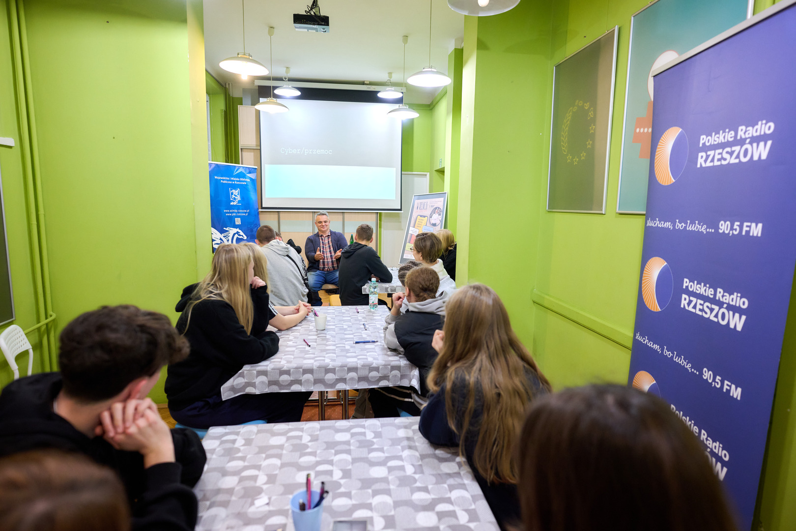 Na początku profesor opowiedział o tym, czym właściwie jest cyberprzemoc, podkreślił, że problem ten coraz częściej dotyka młodych ludzi, zarówno w szkołach, jak i w codziennych kontaktach online. Wyjaśnił, na czym polega hejt w internecie, jakie przybiera formy i jak można rozpoznać sytuacje, w których granica między żartem a przemocą zostaje przekroczona. Zwrócił uwagę na to, że w dobie powszechnego dostępu do mediów społecznościowych każdy z użytkowników ma wpływ na tworzenie tej przestrzeni – poprzez słowa, reakcje, a także przez decyzję o tym, czy i jak reagujemy na krzywdę innych.