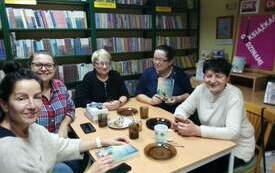 Pięć kobiet siedzi obok siebie, jedna z nich trzyma książkę. Wokół regały z książkami. Pięć kobiet siedzi przy stoliku i trzyma książki. W tle regały z książkami.
