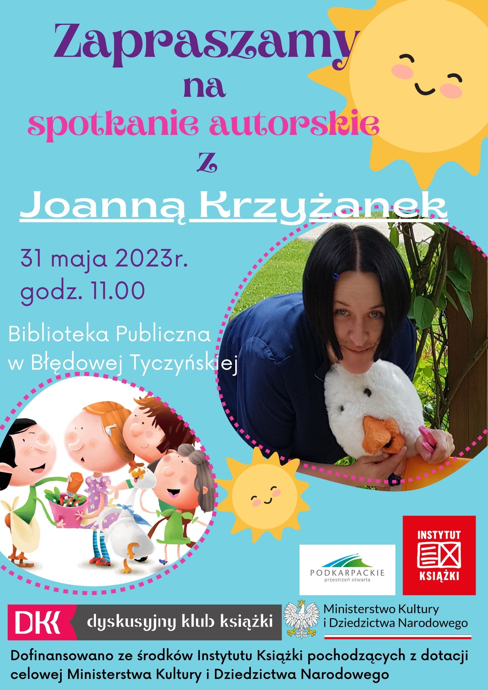 Joanna Krzyżanek - autorka książek dla dzieci. Pisze opowiastki, rymowanki i listy do przyjaciół. Obudziła z wyobraźni Cecylkę Knedelek, Lamelię Szczęśliwą, Maniutkę, Emiliana Aplę, rodzinę Wafelków, Tereskę, Weronikę, Dorotkę, Sabinkę, kota Paplę, psa Kminka, kurę Adelę i gąskę Walerkę. Ma czarne włosy przypominające druciki, niebieskie oczy i kilka zmarszczek na czole. Jest właścicielką starego widelca i czerwonych kaloszy. Potrafi upiec marchewkowe ciasto, uszyć świnkę, zrobić domek z drewna i policzyć poziomki na tarcie. Lubi deszcz, ale nie lubi nowych klamek. Prowadzi warsztaty literackie, ortograficzne, gramatyczne, teatralne, matematyczne, ekologiczne, plastyczne i kulinarne.