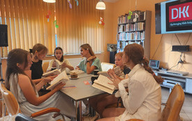 Cztery nastolatki oraz bibliotekarka siedzą wokół stołu i przegląda książki, w tle regały z książkami, na ekranie logo Dyskusyjnych Klubów Książki. Grupa młodych dziewczyn i bibliotekarka trzymają w rękach książki. Grupa nastolatej siedzi przy stole i czyta książki. Grupa nastlatek i bibliotekarka siedzi przy stole, uśmiechają się, trzymają w rękach kubki.