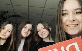 Kilka ksiązek z serii "Rodzina Monet" Trzy nastolatki trzymają ksiąki i logo Dyskusyjncych Klubów Książki. Cztery młode dziewczyny stoją obok siebie, jedna z nich trzyma logo DKK.