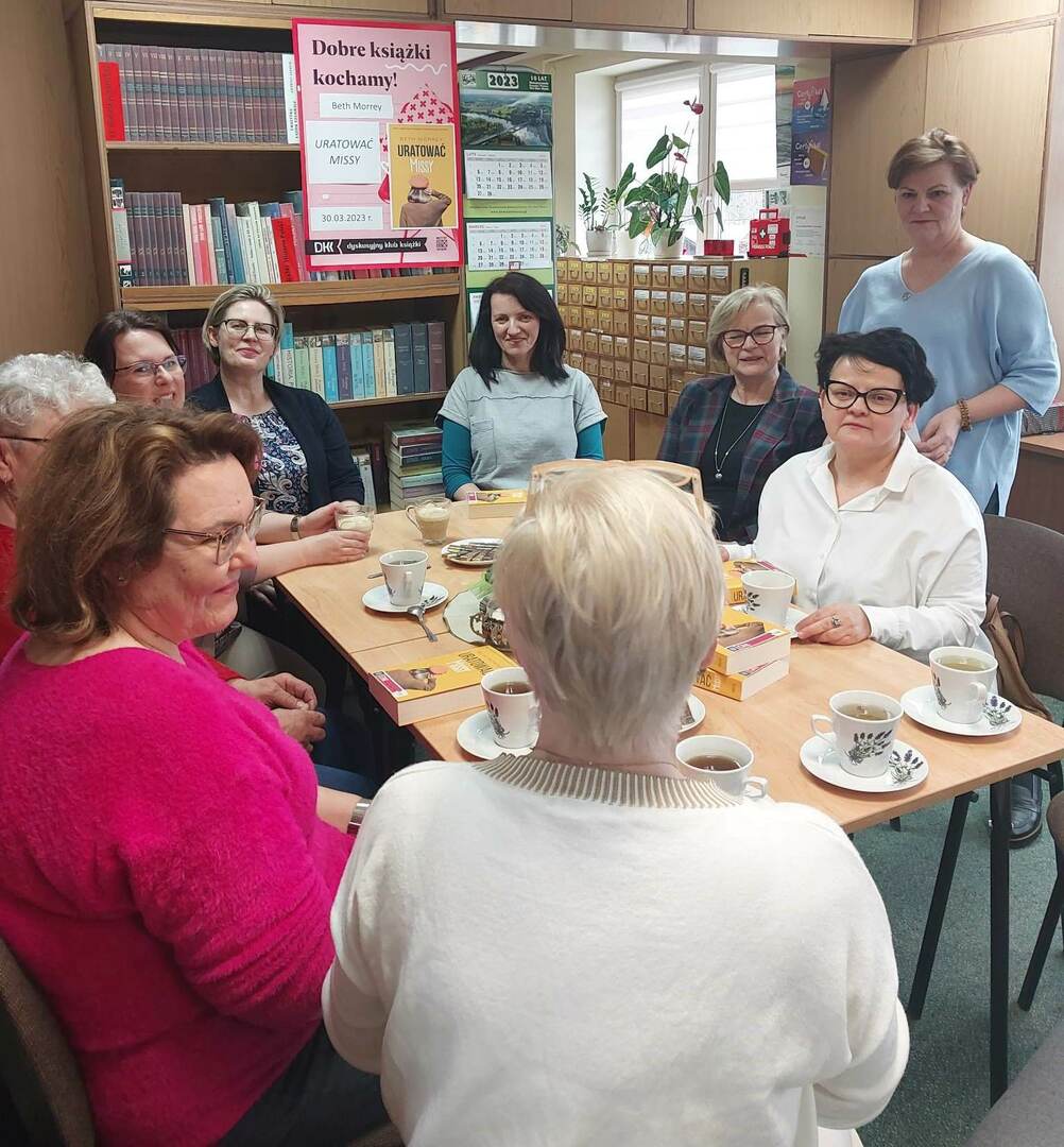 Kilka kobiet siedzi przy stole, śmieją się. Na stole filiżanki, ciastka. W tle drewniane szafki i regały. Grupa kobiet siedzi przy stole, jedna z nich stoi obok. w Tle regały z książkami. Kilka kobiet siedzi przy stole, rozmawia. Na stole znajdują się filiżanki, ciastka. W tle regały z książkami. lada biblioteczna. Grupa kobiet siedzi przy stole i prezentuje książki, jedna z nich stoi obok plakatu Dyskusyjnych Klubów Książki.