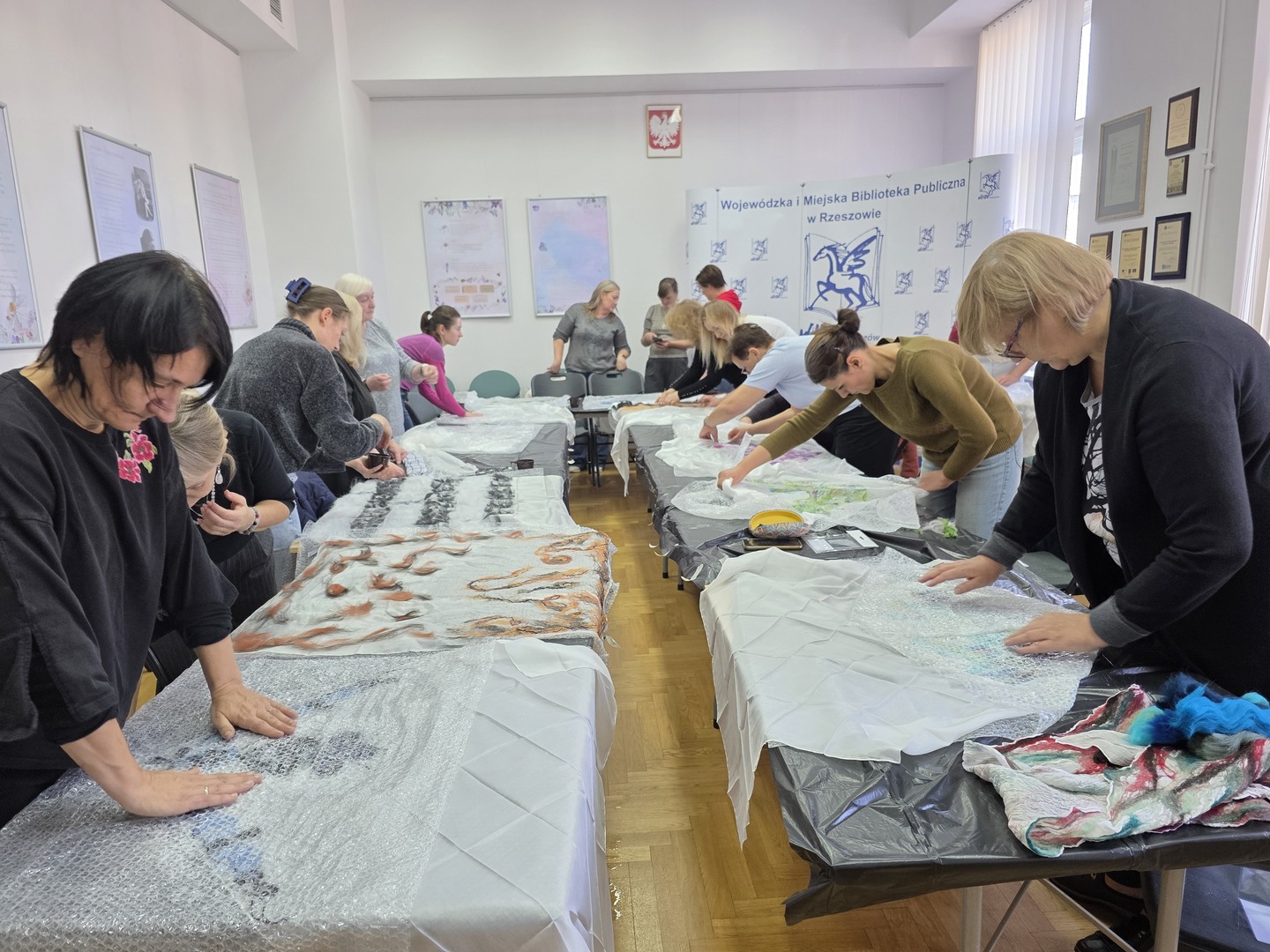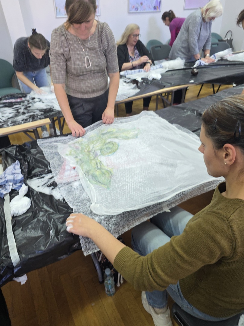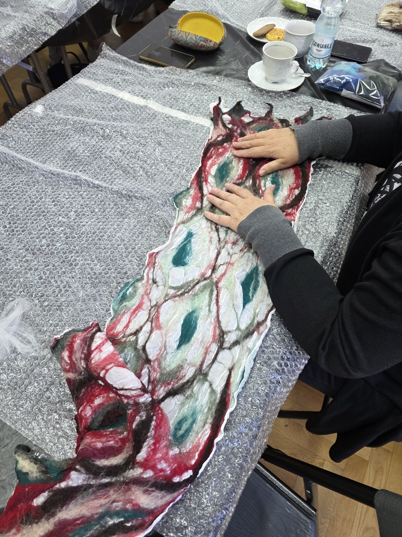 Zaczynając warsztaty rękodzielnicze, instruktorka omówiła poszczególne etapy pracy, zdradzając kolejno tajniki techniki filcowania na mokro. Zaprezentowała także swoje przykładowe prace, sugerując, jakich rezultatów można się po filcowaniu tą metodą spodziewać i jak unikać błędów.