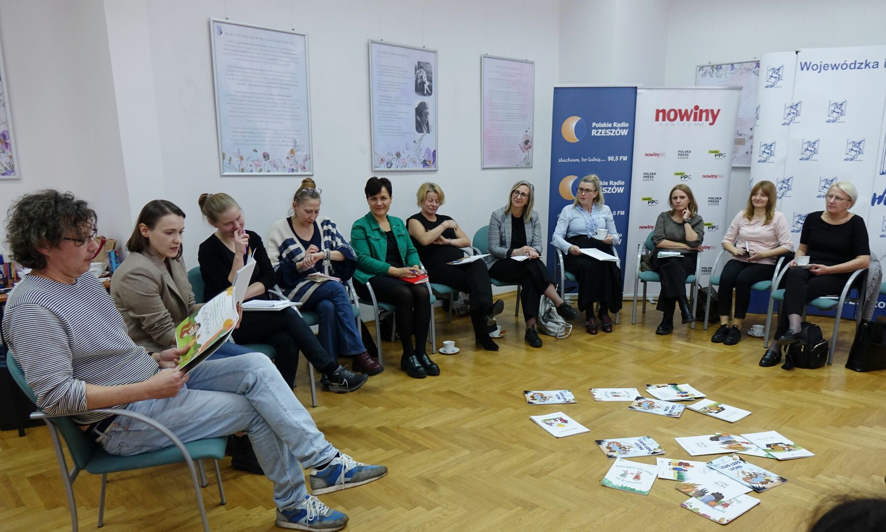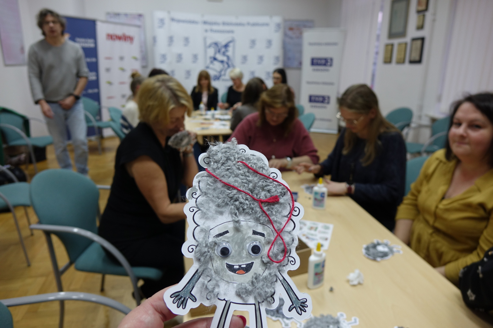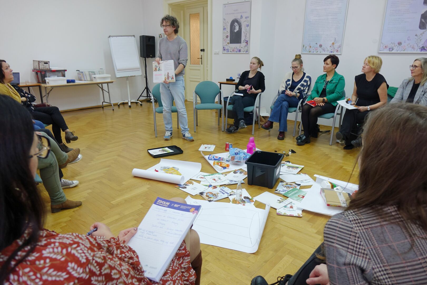 Na krzesłach wokół sali siedzą uczestnicy spotkania. Na podłodze porozrzucane kartki Uczestnicy spotkania siedzący wokół na krzesłach. Prowadzący spotkanie z książką w ręku zwrócony do siedzących wokół uczestników warsztatów. Pośrodku sali pudełko z książkami, wokół uczestnicy spotkania piszący coś na kartkach. Dwie osoby trzymające w rękach dwa końce sznura w formie kulek z materiału. Stworek z papieru z włosami z włóczki. W tle uczestnicy warsztatów.