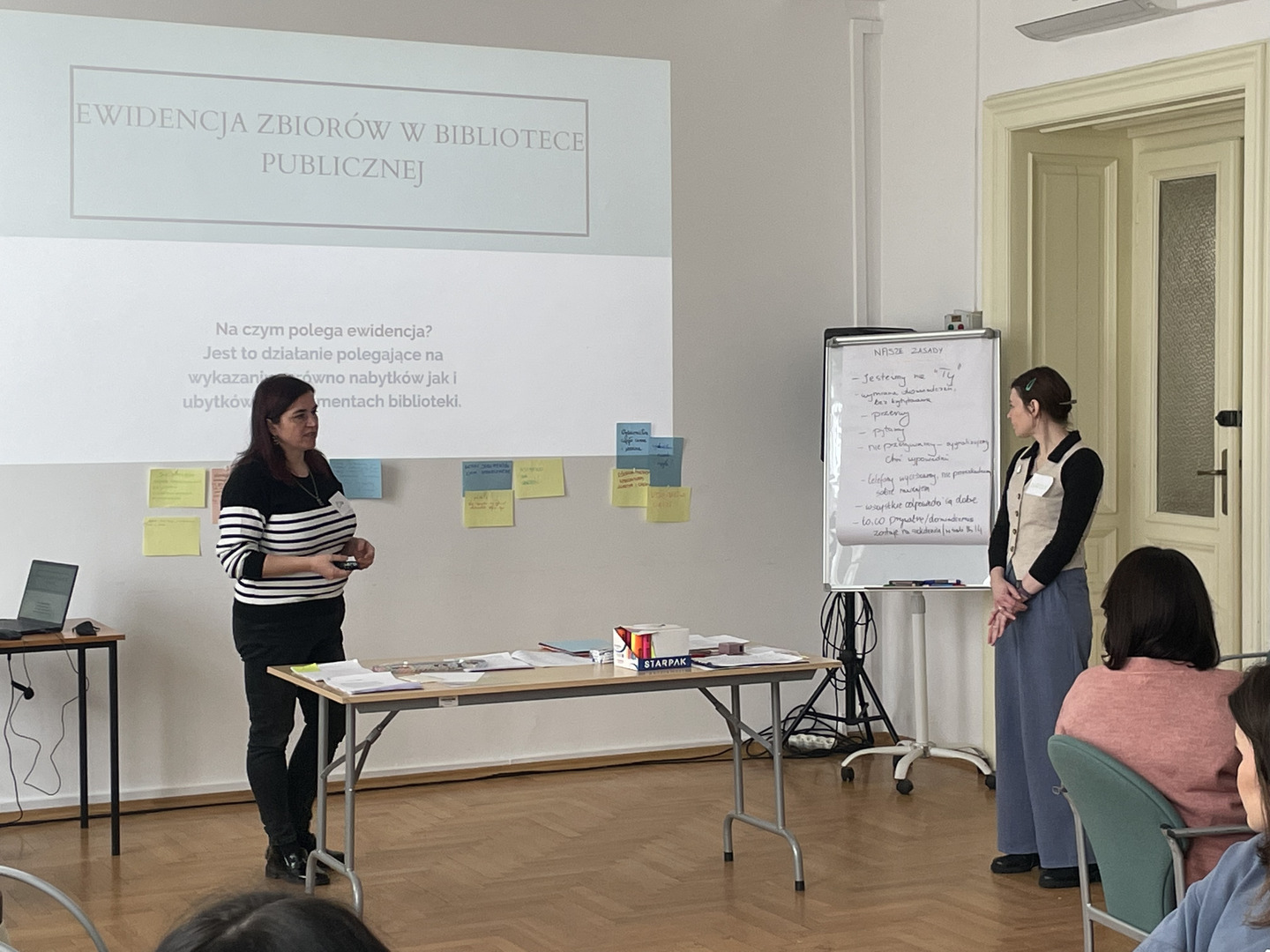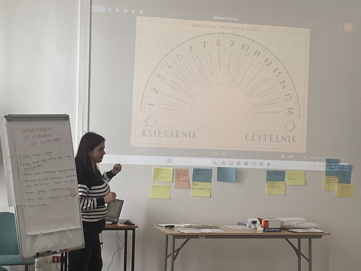 W trakcie szkolenia zwrócono uwagę na to, jaką drogę musi pokonać książka, aby mogła zostać przekazana w ręce czytelnika. Instruktorki omówiły poszczególne kroki prowadzenia dokumentacji zgodnie z obowiązującymi przepisami, skupiając się na tematach związanych z rejestrem przybytków, księdze inwentarzowej, ubytkach, a następnie uczestnicy szkolenia stworzyli praktyczne wskazówki ewidencjonowania i wycofywania zbiorów w formie plakatów.
