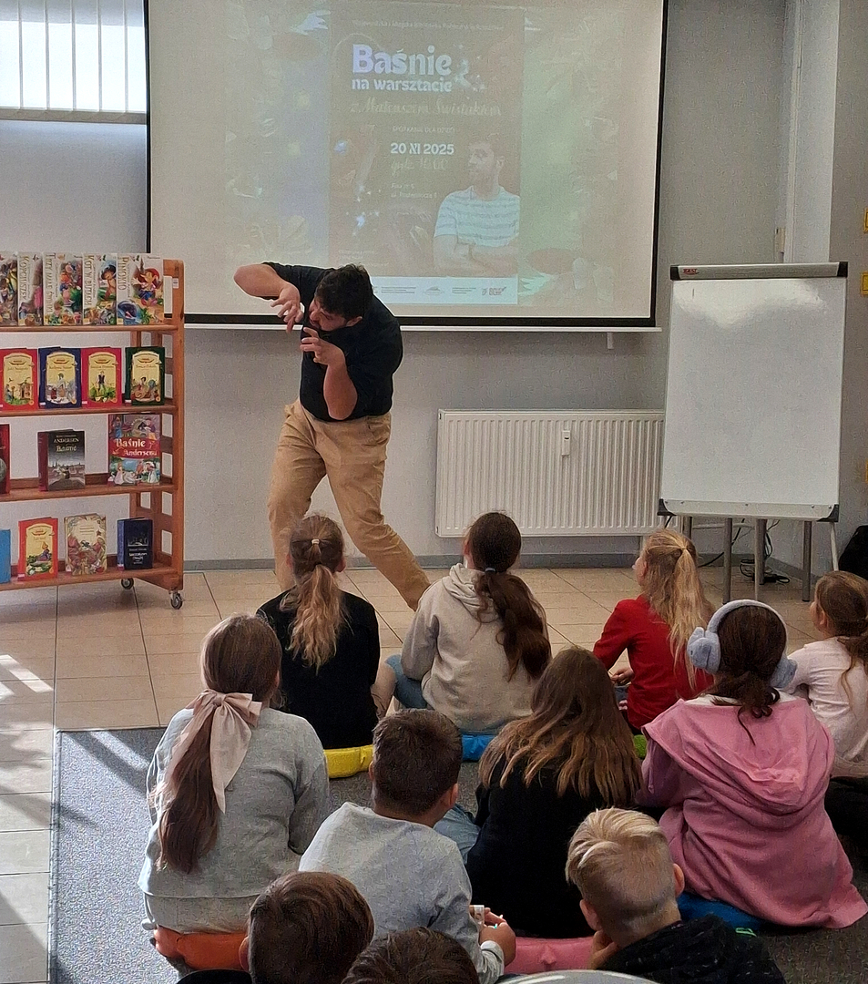 20 listopada 2025 r. Filia nr 6 WiMBP w Rzeszowie przemieniła się w prawdziwą krainę wyobraźni – wszystko dzięki wyjątkowemu gościowi, który przybył do nas z pasjonującymi opowieściami, pełnymi humoru i żywych interakcji. Naszym przewodnikiem po świecie baśni był Mateusz Świstak – opowiadacz, edukator i pisarz, którego misją jest pobudzanie wyobraźni i zachęcanie dzieci do tworzenia własnych historii.