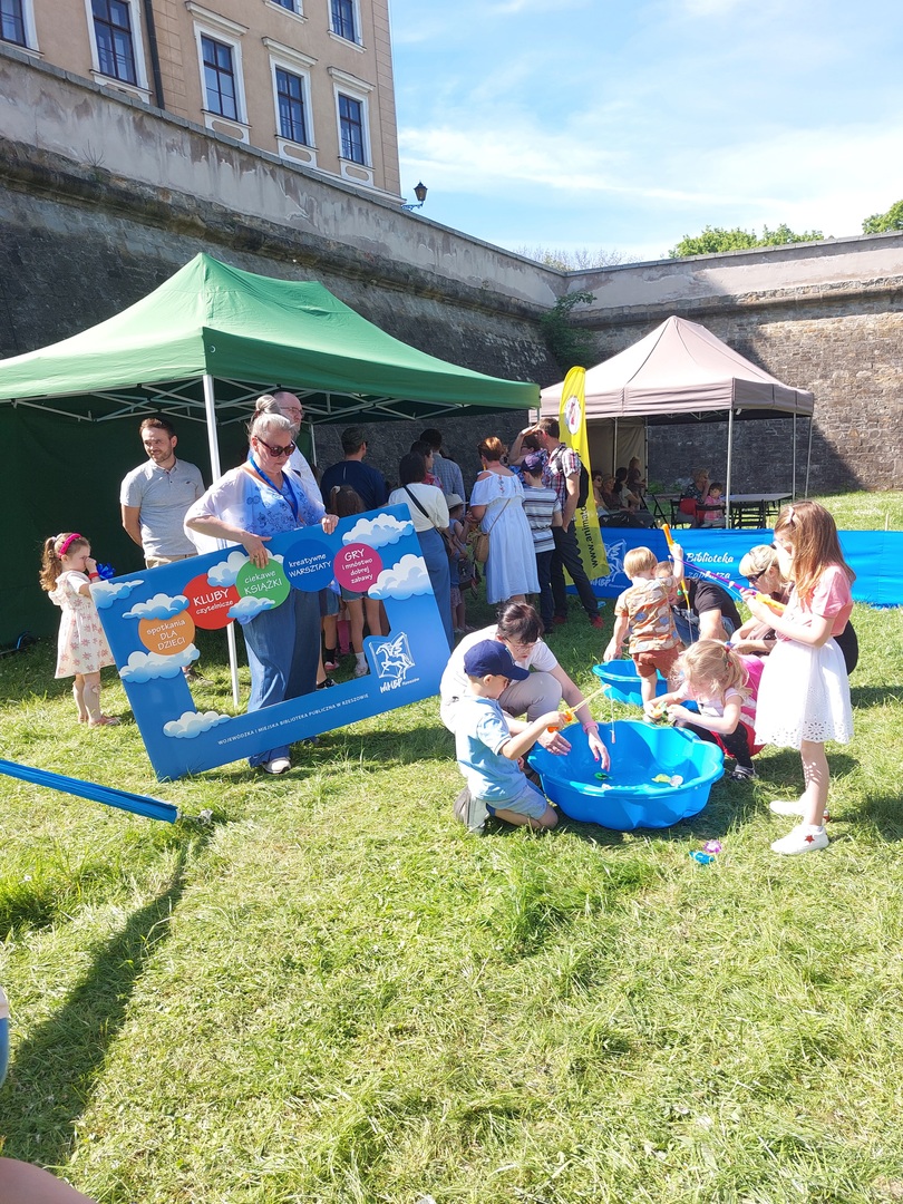 Przedstawione zdjęcia najlepiej opisują atmosferę, jaka panowała w fosie Zamku Lubomirskich. Słoneczna pogoda zachęcała, by wyjść z domu, dlatego kolorowa strefa zabaw przygotowana przez bibliotekarzy przyciągała do wspólnej zabawy całe rodziny.