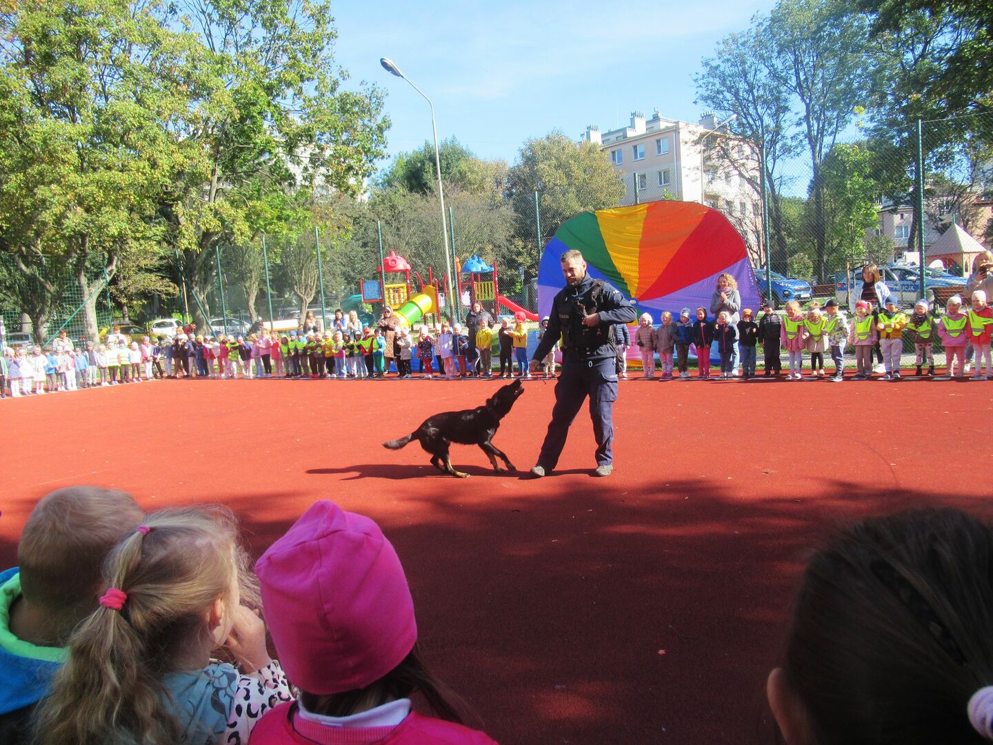 Grupa dzieci kamizelkach odblaskowych siedzi na ławkach wśród zieleni. Przed nimi pluszowy miś. Pluszowy miś, pszczółka, policjanci stoją przed zebraną publicznością. Czytająca policjantka, przed nią grupa dzieci. Na boisku policjant z psem. Wokół dzieci wraz z opiekunami. Grupa dzieci tańczących z kolorowymi pomponami. Dwóch chłopców karmiących alpaki w otoczeniu zieleni.