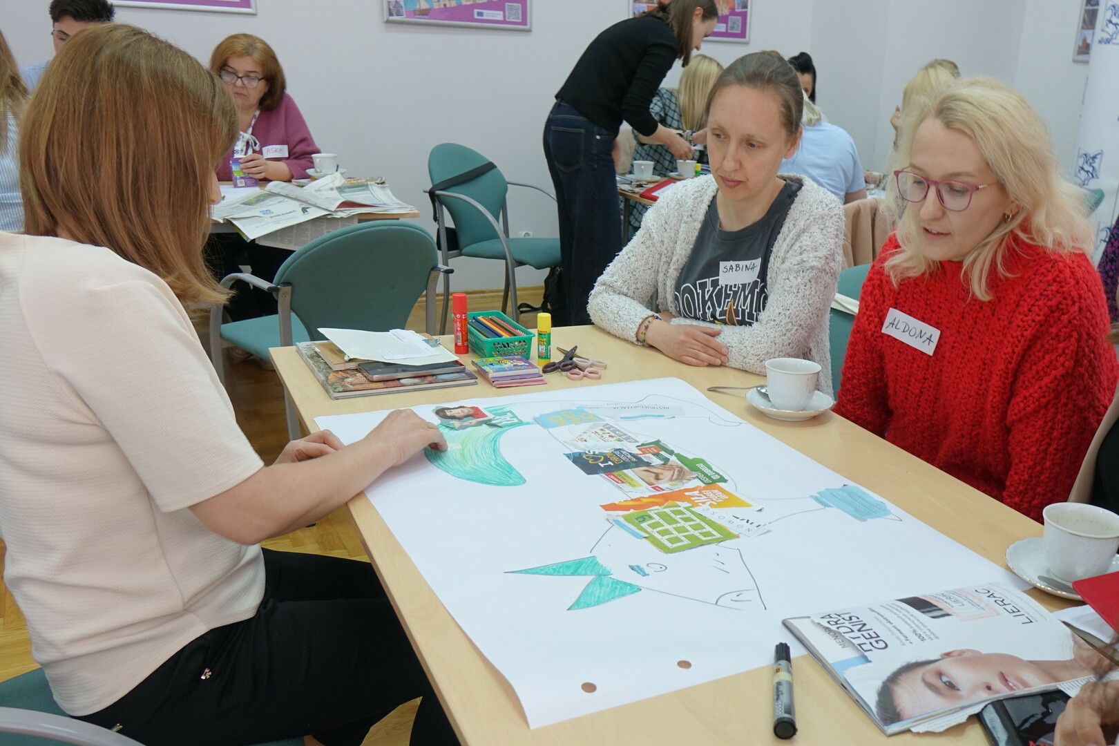 W sali konferencyjnej zebrani uczestnicy szkolenia. Przy dużych stołach siedzą bibliotekarze. Kobieta pośrodku sali z książką w ręku przemawia do zebranych. Kilka bibliotekarek podczas pracy zespołowej. Trzy kobiety wyklejają z kawałków gazet kota. Cztery kobiety w trakcie pracy grupowej. Bibliotekarki z pracą plastyczną. Szkolenie grupowe w sali bibliotecznej. Widok sali z uczestnikami szkolenia. fragment pracy z wycinkami z gazet. Uczestnicy szkolenia stoją przy stolikach. Bibliotekarki słuchają z uwagą prowadzących. Zdjęcie grupowe uczestników szkolenia z dyplomami. Prowadząca tłumaczy coś uczestnikom szkolenia. Widok z tyłu sali i trwające warsztaty. Na dużych arkuszach papieru uczestnicy wyklejają hasła z gazet. Warsztaty, na których bibliotekarze tworzą prace z wycinków gazet. Wręczanie dyplomów uczestnikom. Fotografia z wręczenia dyplomów uczestnikom. Zdjęcie grupowe uczestników warsztatów.