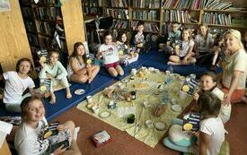 Dzieci siedzące na materacach pomiędzy regałami bibliotecznymi. Wokół rozłożone książki i poduszki. Dzieci trzymają w rękach Focus. Na dmuchanym materacu rozłożone karty do gry, obok grupa dzieci Grupa dzieci podczas zabawy w bibliotece Grupa dzieci podczas zabawy w bibliotece Grupa dzieci je pizze pomiędzy regałami bibliotecznymi. Dziewczynka w czarnej koszulce i spodniach pokazuje coś innym dzieciom. Grupa dzieci siedzi na materacu. Dziewczynka zapisuje na kartce pomysły: Jak pokonać strach? Grupa dzieci na śniadaniu w bibliotece.