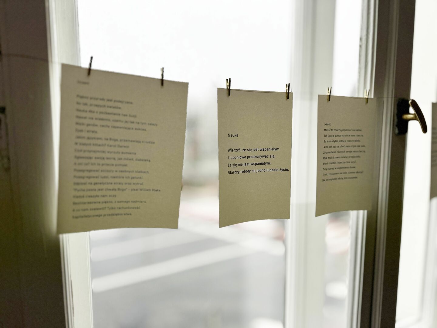 Otwarta książka, na stronie fragnemt wiersza "wcielenie" Dwie rozłożone książki: "Ocalenie" i "Antologia walki" Gabloty wystawiennicze z książkami, nad gablotami wystawa na planszach. Kartki z wierszami przypięte spinaczami do sznureczka.